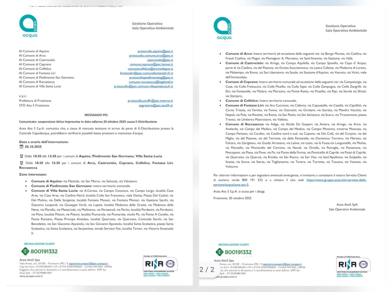 Sospensione idrica improvvisa in data odierna 20 ottobre 20225 causa E-Distribuzione